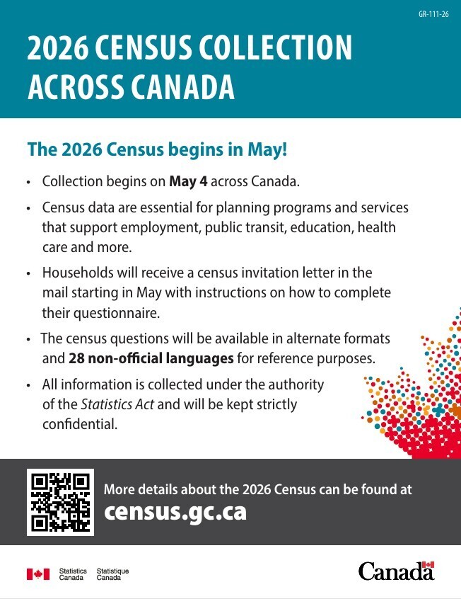 The 2026 Census begins in May! More details about the 2026 Census can be found at : census.gc.ca.
