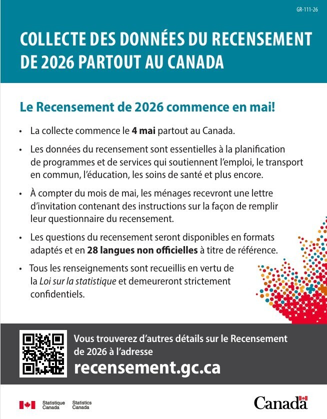 Le Recensement de 2026 commence en mai! Plus de détails sur le Recensement de 2026 à l'adresse : recensement.gc.ca.